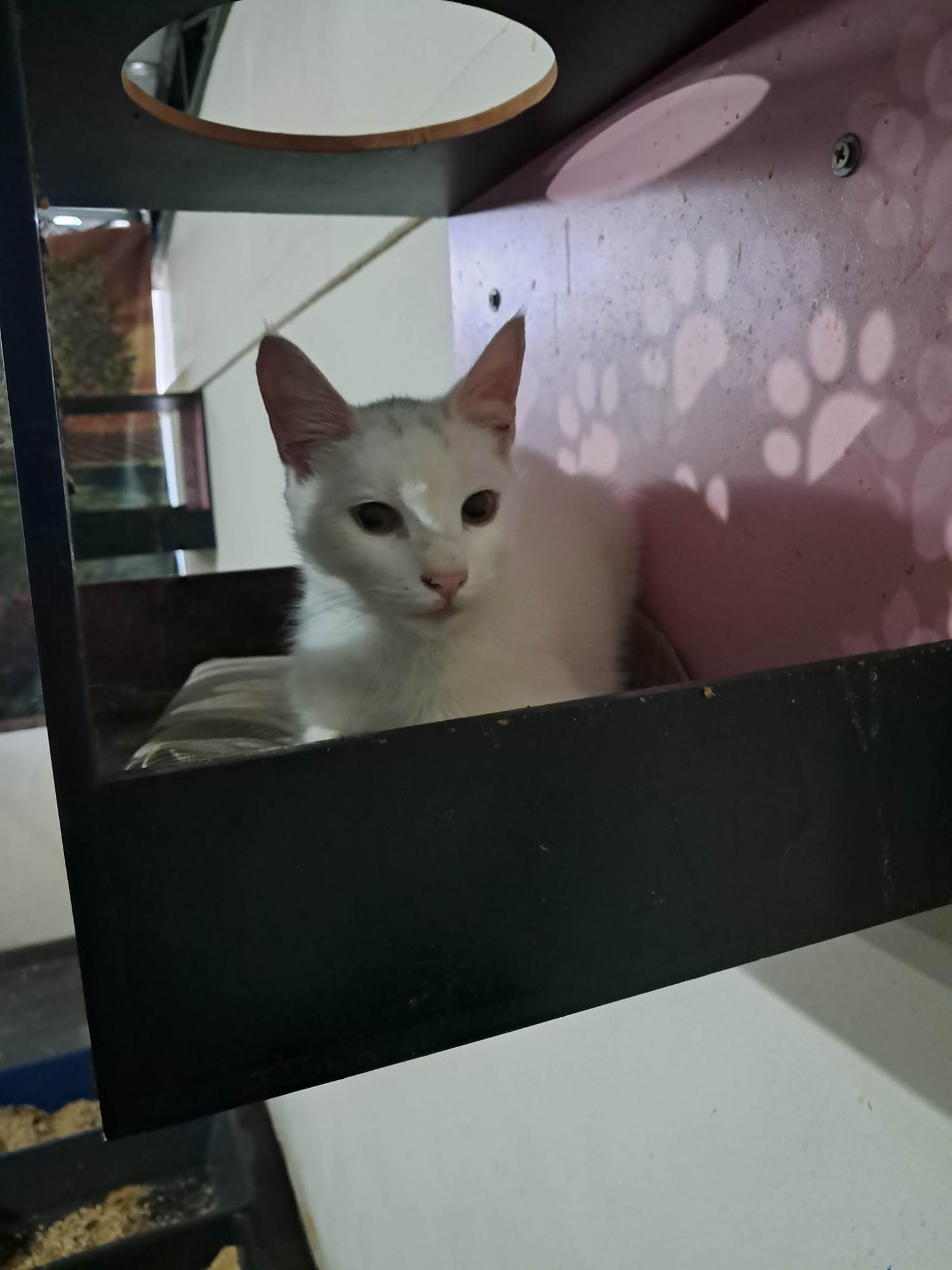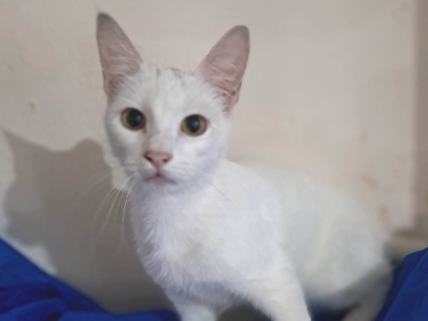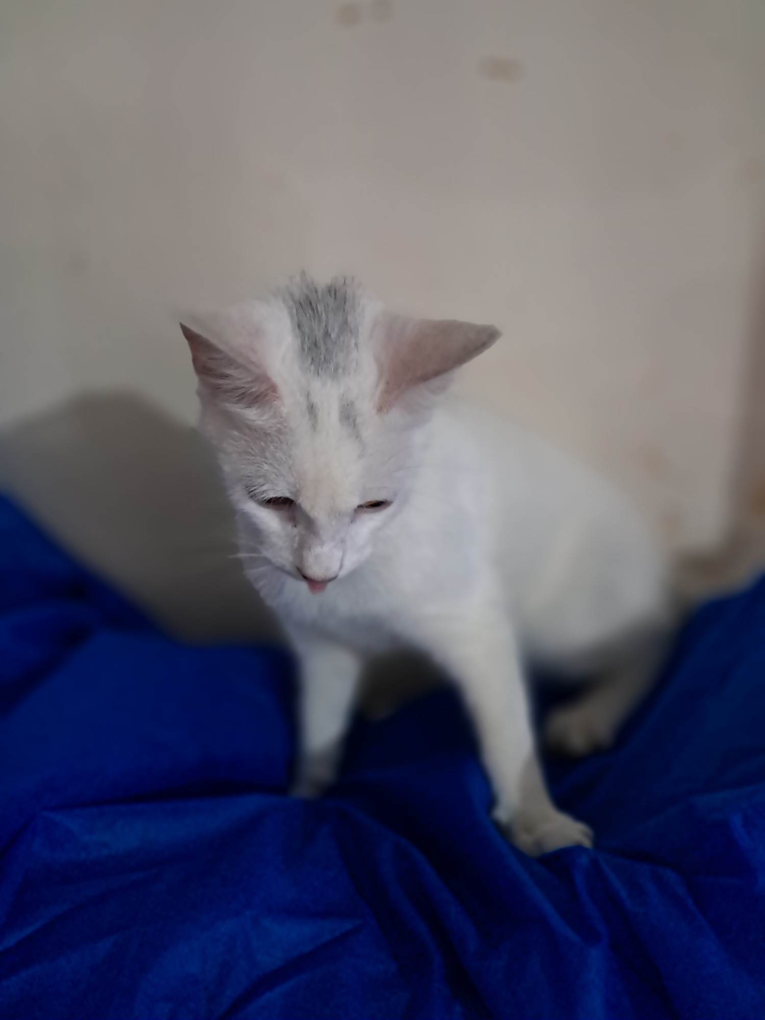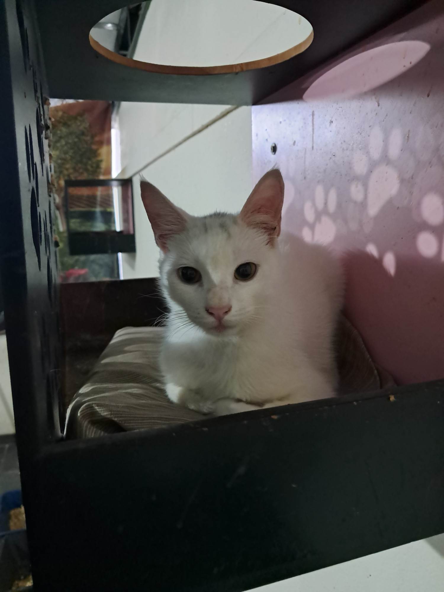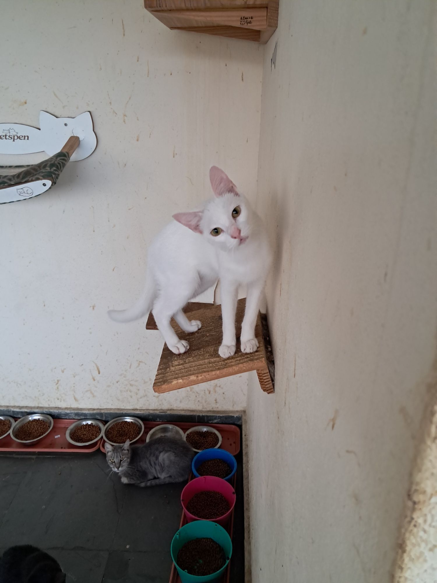 Rony é um lindo gatinho de aproximadamente 6,5 meses, de pelagem branca e uma pequena mecha preta na cabeça. Dócil e carinhoso, foi vermifugado, testado para Fiv/Felv (negativo), vacinado com a V5 e aguarda um lar cheio de amor para chamar de seu. Adoção somente para residências seguras, sem risco de fuga, com redes de proteção nas janelas ou varandas.